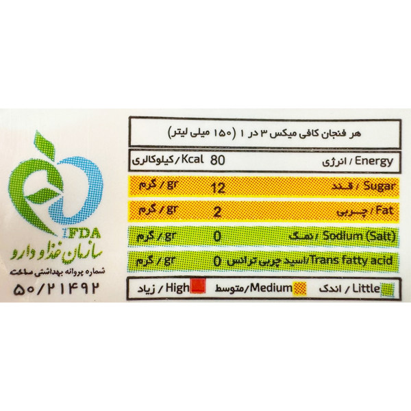 کافی میکس ترکیبی از پودر قهوه فوری، کریمر غیرلبنی و شکر می باشد. کریمر غیرلبنی فاقد لاکتوز و چربی شیر است. کافی میکس نوشیدنی رایج بین خانوادههای ایرانی است که همه به آن علاقه دارند. دو نوع کافی میکس وجود دارد که یکی از آنها علامت سه در یک روی آن قرار دارد شکر در آن وجود دارد و علامت دو در یک آن نشان از عدم وجود شکر است. نوشیدنیهای آماده مانند کافی میکس به دلیل کافئینی که در ترکیبات دارد سبب رفع خستگی، رفع خواب و کسالت خواهد شد همچنین حس نشاط و شادابی در افراد ایجاد میکند افرادی که روزانه فعالیتهای سخت ازجمله ورزش و فعالیتهای بدنی سنگین را انجام میدهند، با مصرف این نوشیدنی خستگی خود را برطرف میکنند. تعداد در بسته بندی ۲۴ عدد وزن هرساشه ۲۰ گرم می باشد. یک ساشه را داخل یک فنجان بریزید، 150 سی سی آب جوش را به آن اضافه نموده، همزده و میل نمائید.